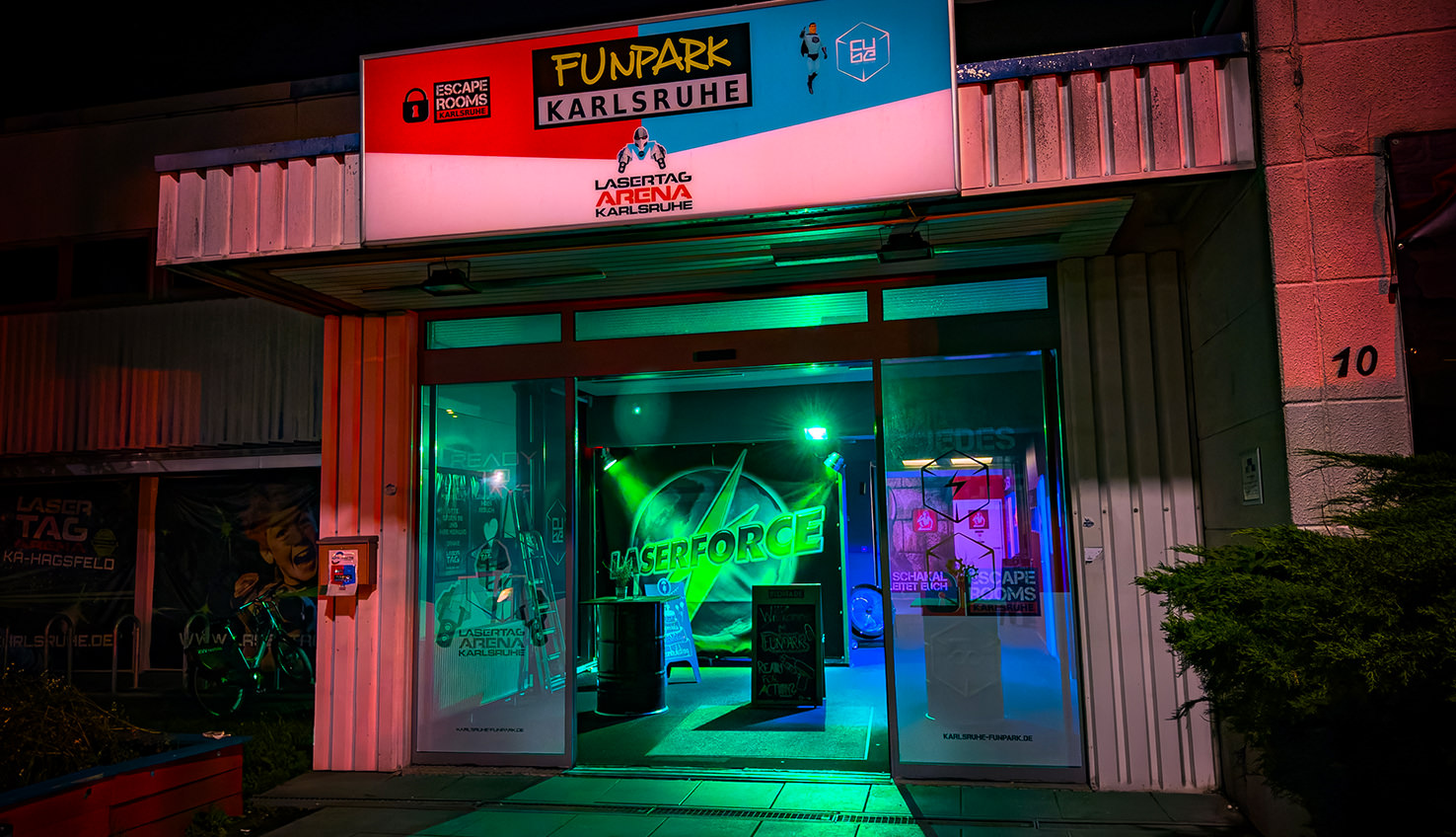 Wir spielen regelmäßig im Funpark Karlsruhe, einer großen und modernen Laserforce-Lasertag-Arena.